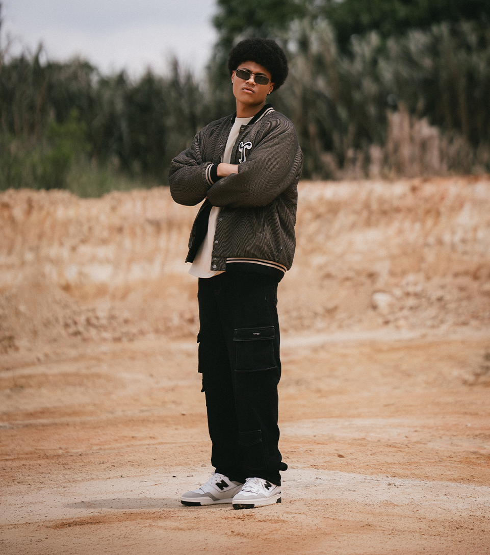 Minimal en la base, audaz en los detalles. Camiseta lisa, bomber oversize texturizada y un jean slouchy estampado que definen el estilo Desert Club : libre, urbano y con personalidad.