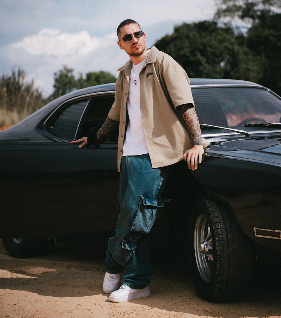 Un look relajado que combina lo clásico y lo street. Camisa boxy bordada en tono arena sobre una base blanca y jean cargo relaxed Typer. Un fit con carácter y frescura.