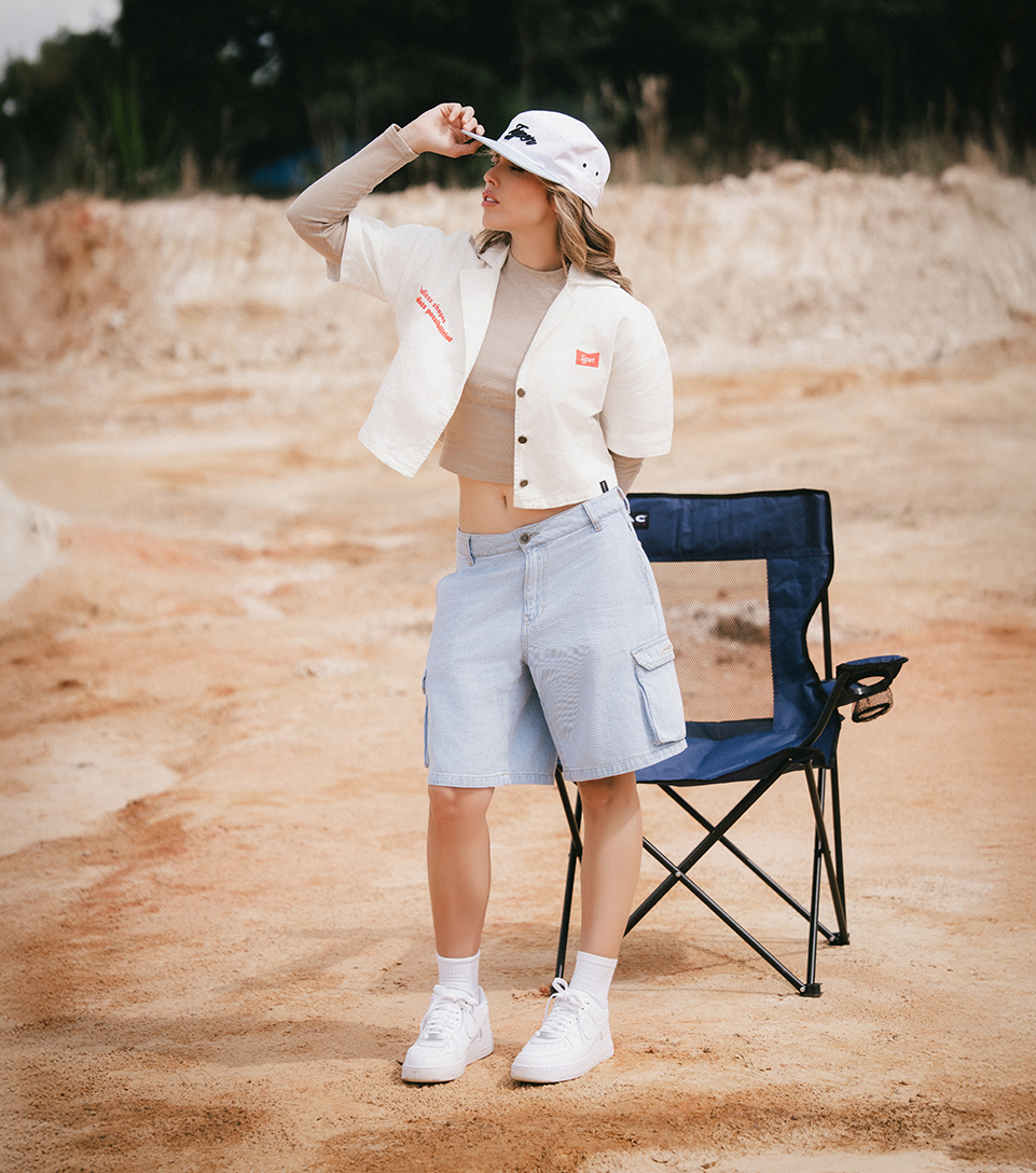 Juego de proporciones con aire sport. Blusa slim fit beige, sobrecamisa boxy de botones, jort baggy cargo y gorra Typer en tonos claros. Un fit relajado que respira Desert Club.